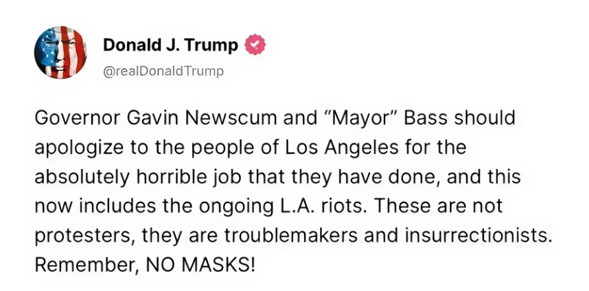 Ngay sau đó, Musk bắt đầu chia sẻ những phát ngôn tích cực về chính quyền Trump, đặc biệt liên quan đến các cuộc biểu tình tại Los Angeles phản đối các cuộc truy quét người nhập cư.