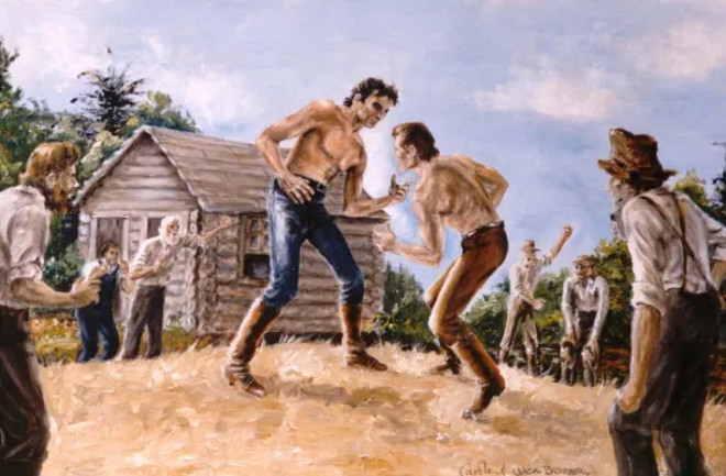 Bức tranh tái hiện trận đấu vật nổi tiếng giữa ông Lincoln và Jack Armstrong. Ảnh: ThoughtCo