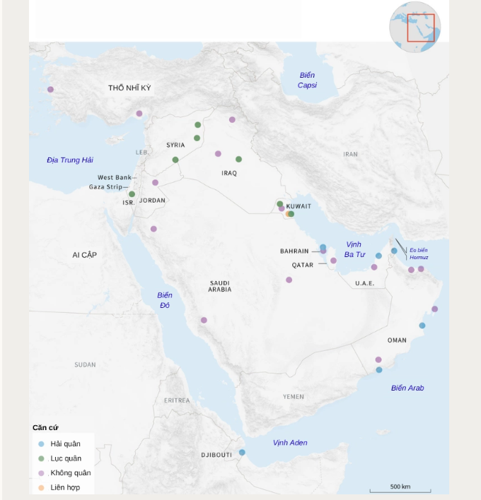 Theo Al Jazeera, Washington có khoảng 40.000-50.000 quân đồn trú ở Trung Đông tính đến giữa năm nay, bao gồm lực lượng đóng tại các căn cứ lớn, cũng như tại các tiền trạm quy mô nhỏ trải khắp khu vực.