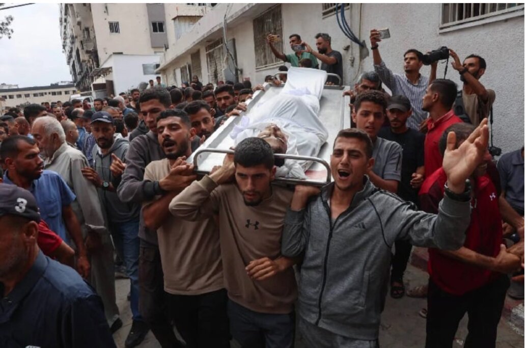 Người dân Palestine khiêng thi thể một người đàn ông thiệt mạng một ngày trước đó khi đang cố gắng nhận viện trợ tại một điểm phân phối gần cửa khẩu biên giới Zikim do Israel kiểm soát trong đám tang tại bệnh viện Al-Shifa ở Thành phố Gaza vào ngày 23/6/2025. (Ảnh của Omar AL-QATTAA)