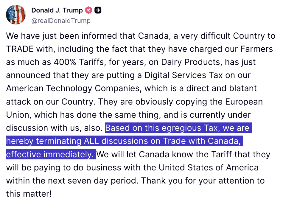 Ngày 27/6/2025, Tổng thống Mỹ Donald Trump tuyên bố trên mạng xã hội Truth Social rằng Washington sẽ chấm dứt ngay lập tức đàm phán thương mại với Canada để đáp trả việc Ottawa áp thuế dịch vụ kỹ thuật số đối với các công ty công nghệ. Ảnh chụp màn hình tài khoản mạng xã hội Truth Social của Tổng thống Mỹ Donald Trump