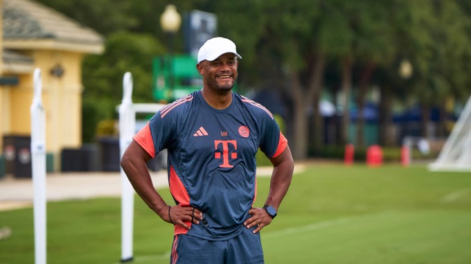 HLV Vincent Kompany thoải mái trong buổi tập một ngày trước trận. Ảnh: FC Bayern