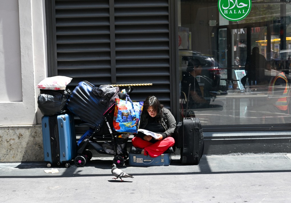 Người vô gia cư chất đầy quần áo và vật dụng cá nhân trên xe đẩy, sống trên vỉa hè ở thành phố San Francisco, bang California, ngày 14/5. Ảnh: AFP