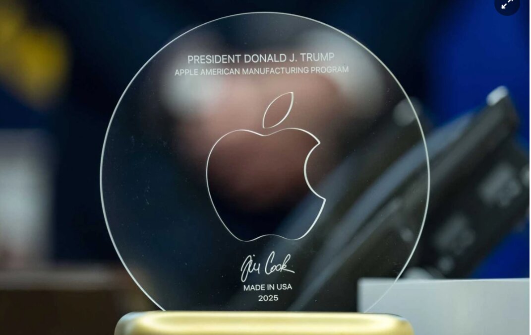 Đến gặp Donald Trump, Cook còn trao tận tay tổng thống một món quà là tấm kính thủy tinh do Apple sản xuất tại Mỹ, được khắc tên Tổng thống Mỹ và đặt trên một đế bằng vàng 24K.