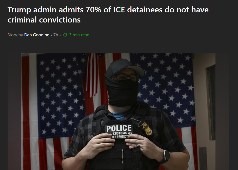 Tính đến thứ Sáu, trong số 61.226 người bị giam giữ, 18.205 người là tội phạm bị kết án, 15.593 người đang chờ truy tố hình sự và 27.428 người bị giam giữ vì các vi phạm nhập cư khác, phản ánh xu hướng bình thường của việc giam giữ ICE.