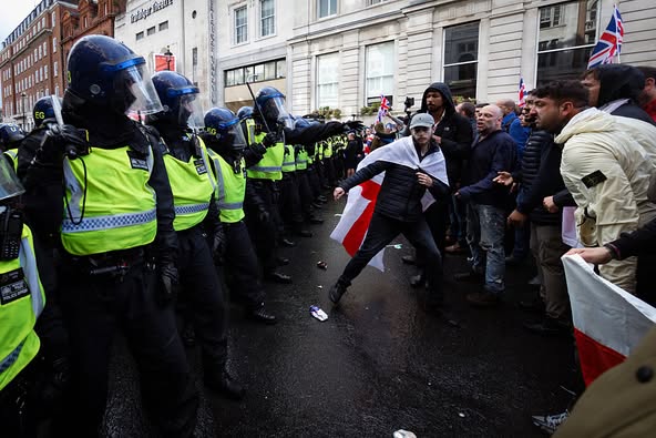 Các cuộc ẩu đả đã nổ ra khi cảnh sát sử dụng dùi cui để cố gắng đẩy lùi những người ủng hộ ông Robinson đang tập trung tại đầu đường Whitehall và quảng trường Trafalgar.