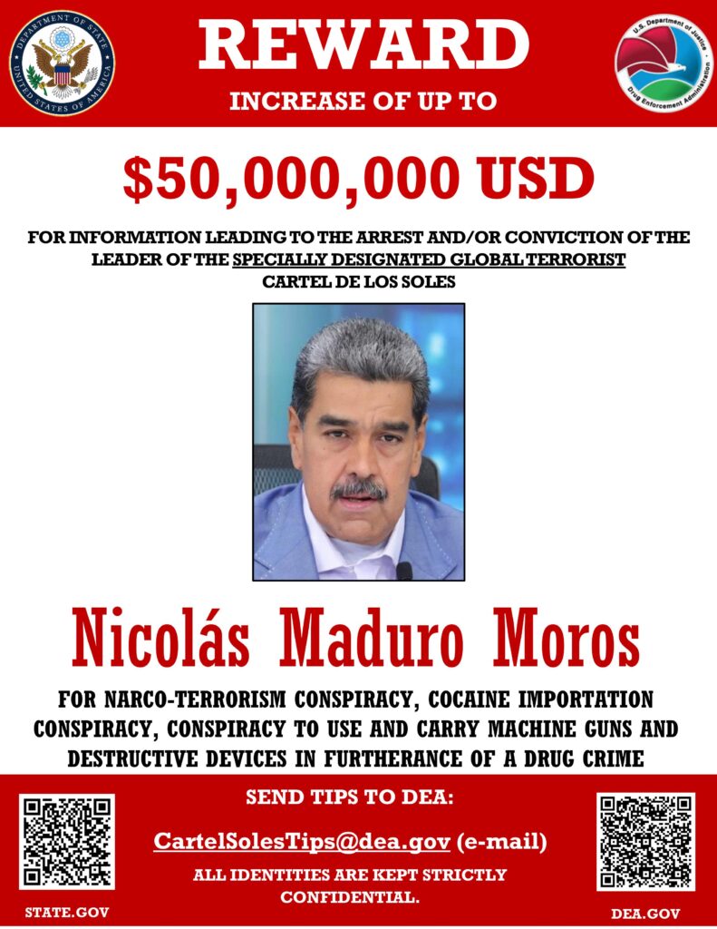 “Maduro helped manage and ultimately lead the Cartel of the Suns, a Venezuelan drug-trafficking organization comprised of high-ranking Venezuelan officials,” the State Department explains on its page detailing the $50 million reward.