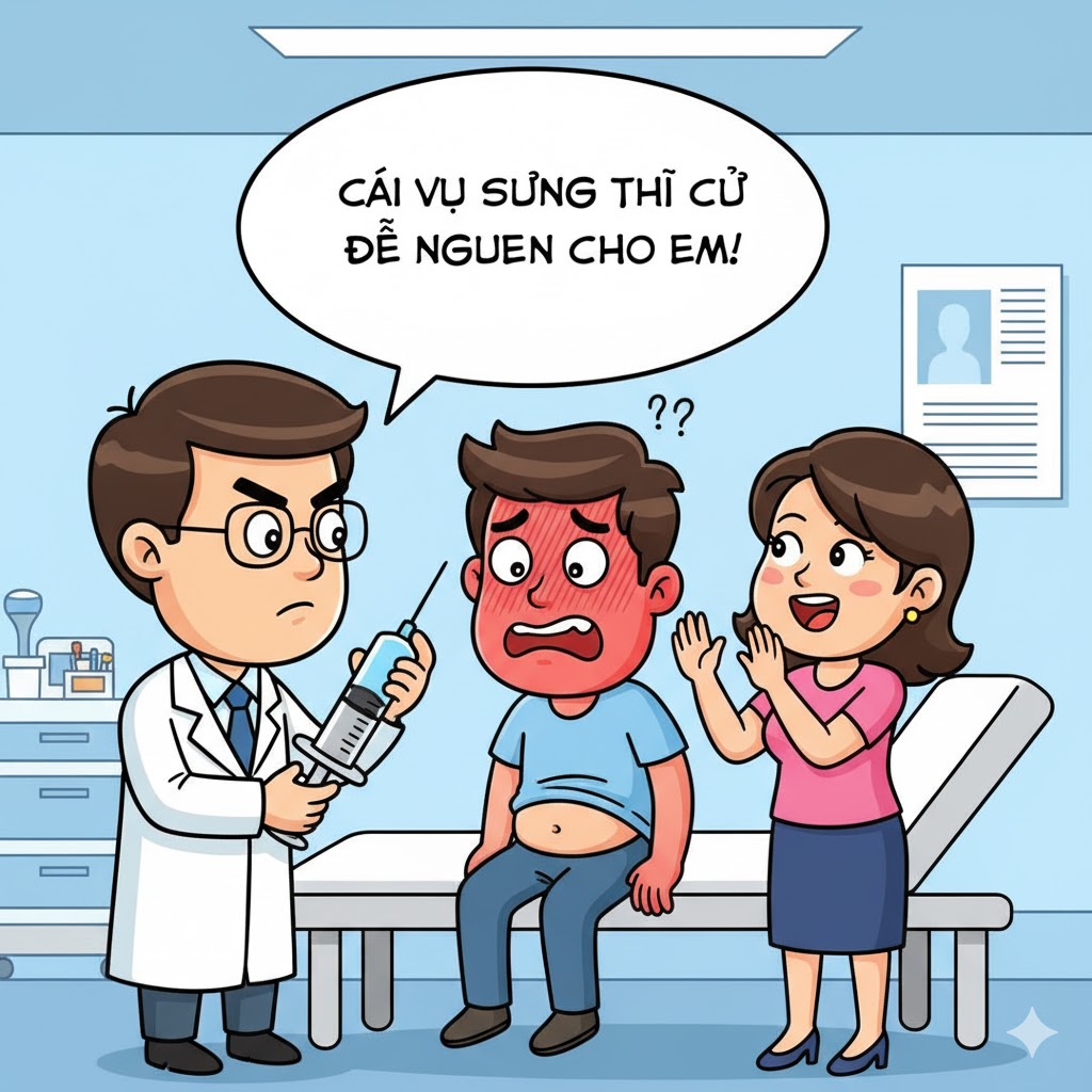 – Ấy bác sĩ coi dzùm, chồng con mỗi lần bị đau thôi, chứ cái vụ sưng như thế thì… cứ để nguyên cho em!