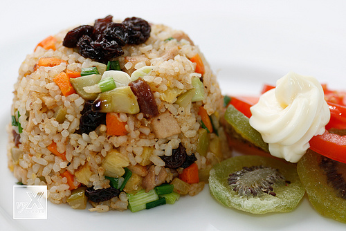 – Đun nóng dầu ăn, phi thơm tỏi. Cho bắp, lạp xưởng, đậu Hà Lan, cơm trắng vào xào.