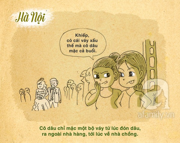 Cỗ cưới ở Sài Gòn có thể kéo dài từ sáng tới chiều như một buổi... đi nhậu. Còn ở Hà Nội, nhiều nhà đi mời đám cưới phải kèm theo quà trong lễ ăn hỏi, mà nhiều khi khách đông, quà ít, nhà gái... méo mặt.