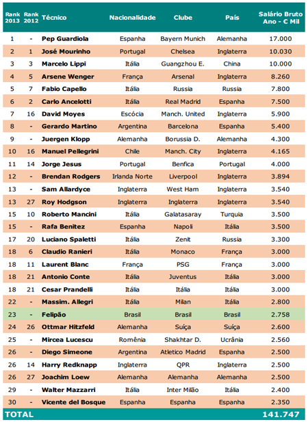 Capello nhận lương 7,8 triệu euro/năm khi dẫn dắt ĐT Nga và Ancelotti, hưởng lương 7,5 triệu euro/năm ở Real Madrid, đứng thứ 4,5 trong danh sách này. Trong khi đó, David Moyes ở vị trí thứ 6 khi “đút túi” 6 triệu euro/năm ở MU. Đây được xem là cú nhảy vọt của chiến lược gia này khi năm ngoái, ông vẫn đứng thứ 16.