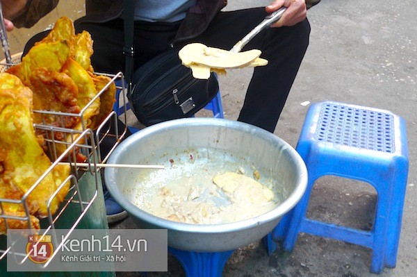 Bánh khoai lại dành cho những người thích cái gì đó "xôi thịt" hơn. Khoai được xắt mỏng, rồi cũng thả vào cái hỗn hợp bột màu trắng kem dễ chịu đấy, sau đó mới thả vào chảo rán. Bánh cũng có lớp vỏ giòn béo, nhưng lớp nhân lại mềm, bở và hơi dai dai, xốp xốp. Ăn vừa ngậy, vừa thơm, vừa... bột bột, vừa ngọt cái ngọt rất... hồn hậu của khoai lang.