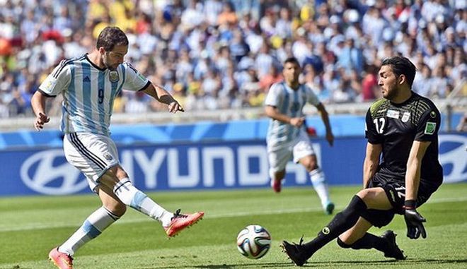 13': NGUY HIỂM! Đồng đội chuyền bóng xuống rất đẹp cho Higuain băng vào dứt điểm trong thế đối mặt thủ thành Haghighi nhưng thủ môn Iran đã băng ra rất nhanh làm hẹp góc sút và Higuain không thể dứt điểm thành công.