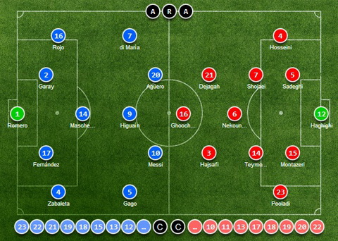 Argentina: Romero, Zabaleta, Garay, Fernández, Rojo, Mascherano, Gago, di María, Messi, Agüero, Higuaín.