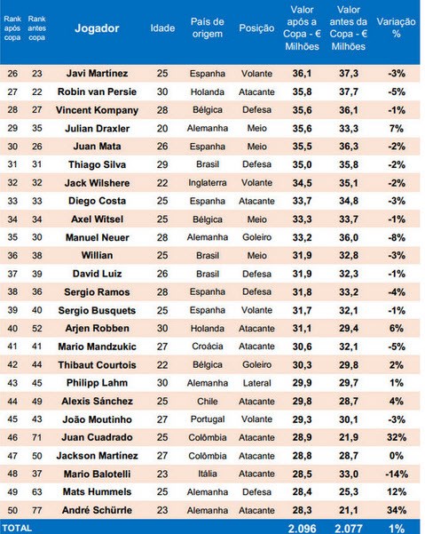 Công ty kinh doanh và tư vấn thể thao Brazil - Pluri Consultoria đã biên soạn và công bố danh sách 50 cầu thủ có giá trị nhất sau khi World Cup 2014 kết thúc.