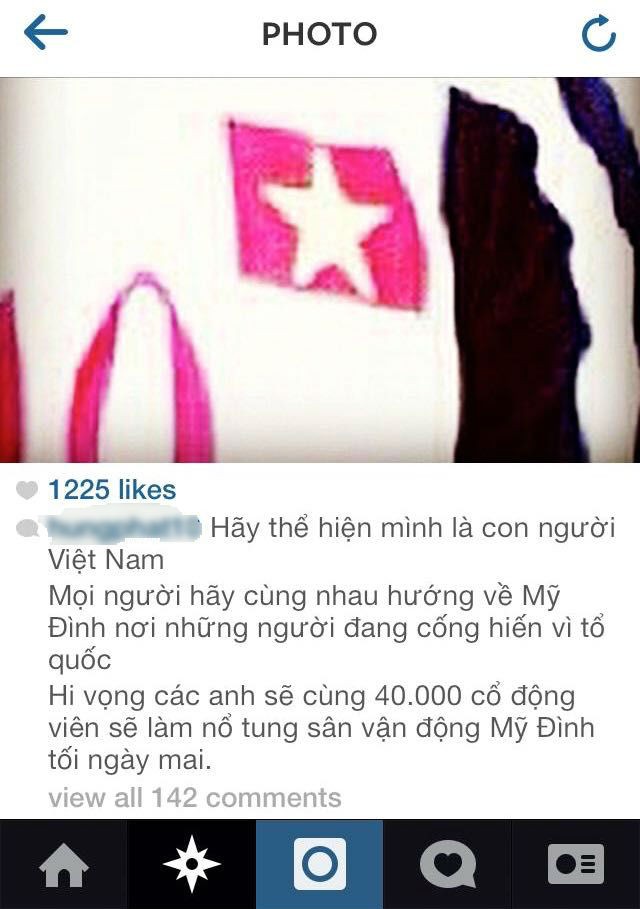 Trước trận đấu khai mạc AFF Cup 2014 của ĐTVN, Công Phượng đã chia sẻ trên trang Instagram của mình: "Mọi người hãy cùng nhau hướng về Mỹ Đình, nơi những người đang cống hiến vì tổ quốc. Hy vọng các anh cùng 40.000 CĐV sẽ làm nổ tung SVĐ Mỹ Đình". Trận đấu giữa ĐT Việt Nam gặp ĐT Indonesia sẽ diễn ra vào lúc 19h tối nay (22/11).