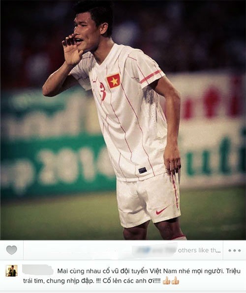Cũng giống như đồng đội Công Phượng, Đông Triều gửi thông điệp ngắn tới người hâm mộ: "Cùng nhau cổ vũ đội tuyển Việt Nam nhé mọi người. Triệu trái tim chung nhịp đập, cố lên các anh ơi".