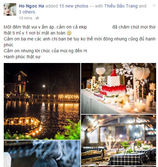 Thể hiện cảm xúc trên trang cá nhân, nữ ca sĩ viết: "Một đêm thật vui vẻ, ấm áp. Cảm ơn cả ekip đã chăm chút mọi thứ thật tỉ mỉ ở một nơi bí mật an toàn. Cảm ơn ba mẹ, các anh chị bạn bè. Tuy không thể mời đông đủ nhưng cũng đủ hạnh phúc. Cảm ơn những lời chúc của mọi người đến Hà. Hạnh phúc thực sự".