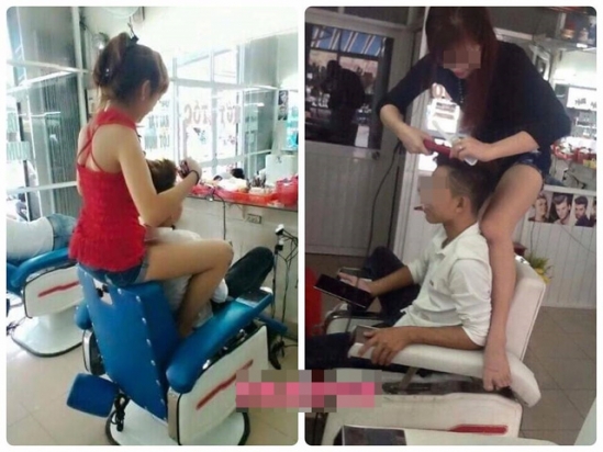 Trong bức ảnh, 2 nữ nhân viên khác nhau trong 1 cửa hàng đều diện đồ khá mát mẻ và đang làm tóc cho các khách hàng nam. Hình ảnh ấy sẽ chẳng có gì đặc biệt để bình luận nếu như 2 cô gái này không trèo hẳn lên ghế, quằng chân qua cổ khách hàng nam để tiện cho công việc.
