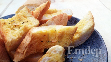 - Bánh mì cắt thành từng lát vừa ăn. Sau đó phết bơ thực vật, 1 chút muối, tỏi băm nhỏ và 1 ít lá rosemarry lên trên, cuối cùng xếp lên khay nướng.
