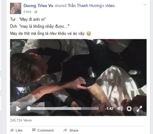 Dương Triệu Vũ bày tỏ sự tức giận của mình khi nói về chấn thương của Đàm Vĩnh Hưng, cho rằng hành động của nhà báo ấy "sao mà ác quá". Thêm nữa, nam ca sĩ cũng buồn bã cho rằng, không phải ai cũng có thể thấu hiểu được hoàn cảnh của người khác. Kèm theo câu chú thích là hình ảnh Đàm Vĩnh Hưng đang nằm trên bàn mổ để khâu vết thương.