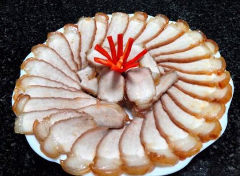 - Tắt bếp, để thịt nguội, cắt mỏng, bày ra đĩa, trang trí ớt sừng tỉa hoa.