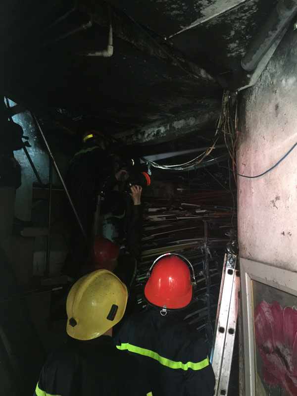 Khói đen kịt tại cửa hàng bán tranh Huy Hoàng, trên gác 2 là vợ chồng nghệ sĩ Chiều Xuân ở.