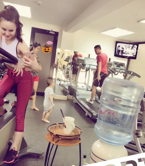 Đã nhiều lần nữ ca sĩ “Đồng Xanh” khoe hình ảnh chồng và con trai trên trang cá nhân của mình. Nhưng phần lớn những hình ảnh mà cô đăng tải đều khoe khéo ông xã với những hình ảnh được chụp từ phía sau hoặc chụp nghiêng. Và cũng như mọi lần, Vy Oanh khoe ảnh gia đình cùng nhau tập gym. Người đẹp hào hứng khoe: “Đang tập thì bị bạn kia nhảy vào phá đám, cũng may bạn đòi ba chứ không đòi mẹ, thế là mẹ vẫn tiếp tục ...ba nghỉ nha. Hai đứa cũng bày đặt đồng phục thể thao đỏ”.