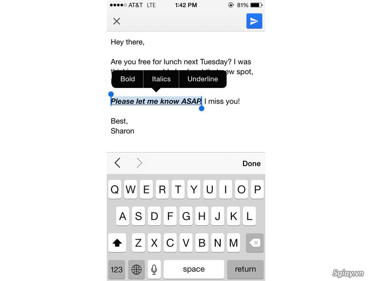 Trong một số ứng dụng Mail, bạn có thể điều chỉnh chữ đậm, chữ in nghiêng, chữ được gạch chân. Để kích hoạt chức năng ẩn này, bạn phải bôi đen dòng chữ đó, chọn “Bold/Italics/Underline”. Một tính năng rất căn bản và hữu ích mà chắc hẳn rất ít ai để ý phải không nào?