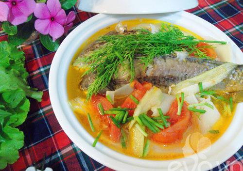 Cá chép làm sạch rồi cắt đôi, ướp chút muối, mì chính. Cà chua thái thành các múi cau, hành tím băm nhỏ, hành hoa, thì là thái nhỏ.