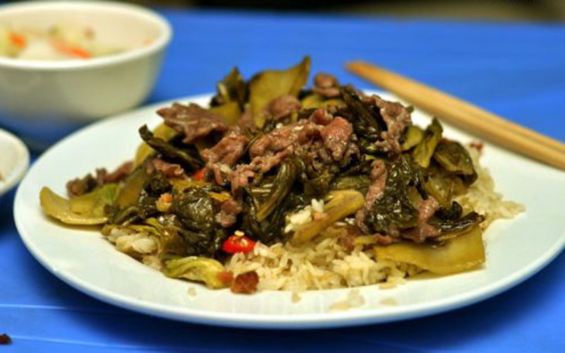 Sau khi cho chảo và dầu ăn lên bếp, bạn đun tới khi dầu vừa nóng, cho cơm đã trộn đều với trứng vào, nhanh tay đảo đều cơm. Lưu ý là không để dầu sôi quá, bởi như vậy khi cho cơm vào sẽ cháy, hạt cơm bết lại không ngon. Chú ý là để lửa nhỏ, đảo đều cơm trong chảo, sau đó là tới lúc cho dưa chua vào, tiếp tục đảo đều tay,, rồi nêm nếm gia vị: xì dầu, muối ăn, cho vừa miệng. Bật mí: Xì dầu là một trong những gia vị khiến cơm rang ngon, cơm mềm và thơm hơn rất nhiều.