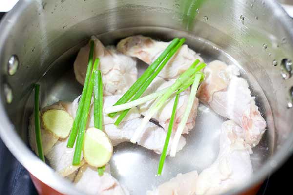 Bước 1: Cánh gà ngâm với nước lạnh khoảng nửa giờ, rửa sạch. Cho vào nồi với hành tây, gừng, nấu sôi trong 5 phút sau đó vớt ra để ráo nước.