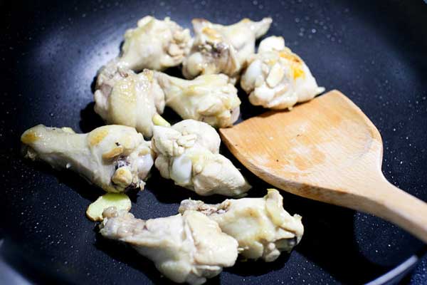 Bước 2: Làm nóng chảo có chứa dầu, cho cánh gà vào xào đến khi chuyển màu hơi vàng.