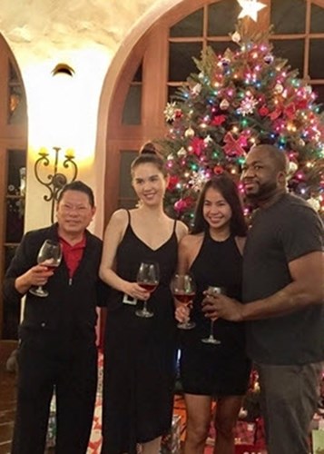 Lần đầu tiên Ngọc Trinh sang Mỹ ra mắt gia đình bạn trai. Tham dự một bữa tiệc, người đẹp mặc váy đỏ cùng tông với tỷ phú 72 tuổi.
