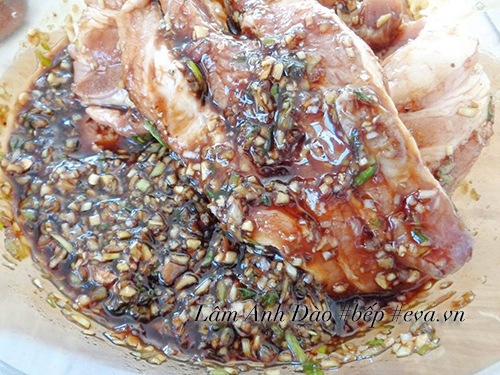 Bước 2: Thịt để nguyên miếng rửa sạch, cho thịt vào tô gia vị trộn đều để ít nhất 4 tiếng hay qua đêm cho thịt thấm gia vị.