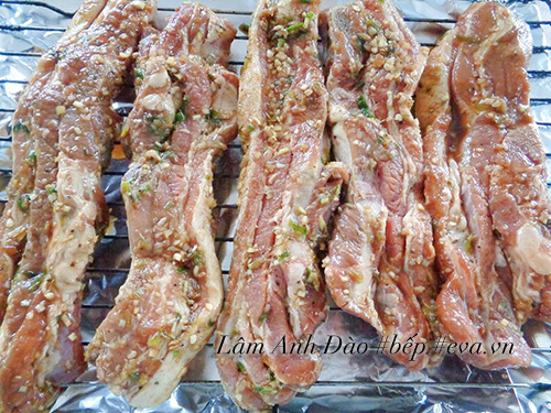 Bước 3: Thịt sau khi thấm gia vị, xếp lên vỉ hay khay có lót giấy bạc.