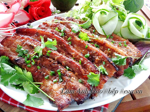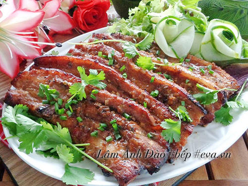 Thịt ba chỉ nướng hành xếp ra dĩa có xà lách, dưa leo. Món này ăn với cơm hay bún rất ngon. Khi ăn có thể dùng kéo cắt miếng vừa.