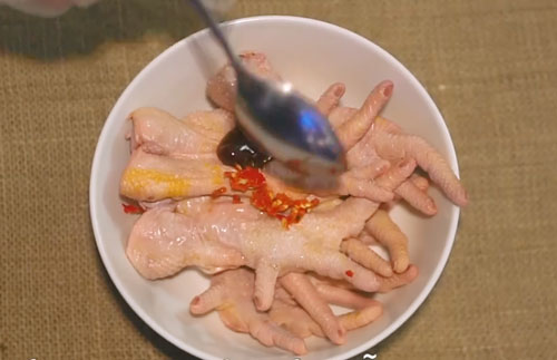 1. Ngâm chân gà trong một thau nước pha muối và gừng giã nát trong khoảng mười phút. Sau đó đem rửa thật sạch và chẻ đôi nhưng không để đứt hẳn lớp da giữa hai phần chẻ.