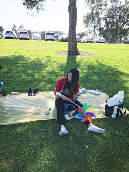 Cựu người mẫu chia sẻ những hình ảnh bình yên khi cùng mẹ đưa con trai nhỏ đi dã ngoại.