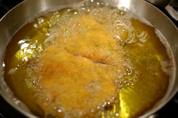 - Làm nóng dầu tới 180°C, thả thịt vào chiên khoảng 13 phút tới khi vàng đều cả 2 mặt.