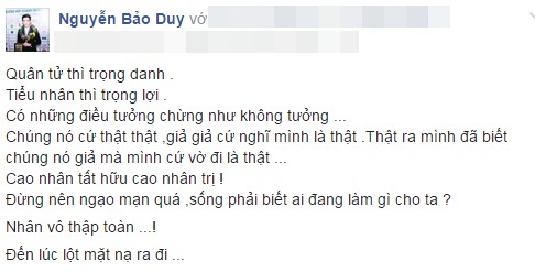 Trên trang cá nhân của mình, Bảo Duy bất ngờ đăng tải đoạn trạng thái khá dài nhằm bày tỏ tâm trạng bức xúc. Theo đó, vị doanh nhân trẻ này bày tỏ, "Quân tử thì trọng danh. Tiểu nhân thì trọng lợi. Có những điều tưởng chừng như không tưởng. Chúng nó cứ thật thật, giả giả cứ nghĩ mình là thật. Thật ra mình đã biết chúng nó giả mà mình cứ vờ đi là thật. Cao nhân tất hữu cao nhân trị! Đừng nên ngạo mạn quá, sống phải biết ai đang làm gì cho ta? Nhân vô thập toàn ...! Đến lúc lột mặt nạ ra đi".