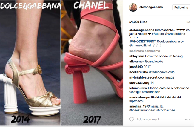 Trên Instagram cá nhân, NTK Stefano Gabbana - một nửa linh hồn của nhà mốt nước Ý đã cho đăng tải một hình ảnh đầy ngụ ý. Một bên là đôi sandals cao gót thuộc BST Xuân-Hè 2014 của Dolce&Gabbana, bên còn lại là đôi sandals buộc dây mang âm hưởng chiến binh vừa được ra mắt trong BST Cruise 2018 của Chanel.