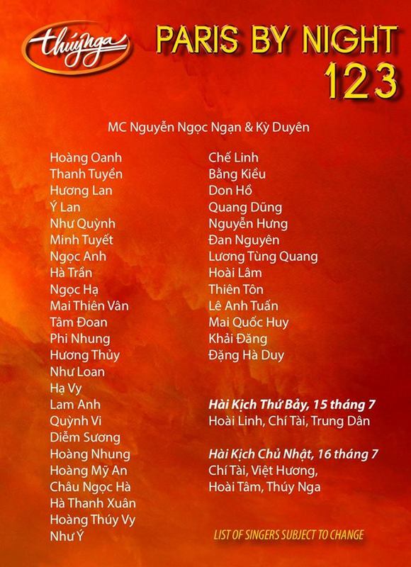 VBF-Theo thông tin mới nhất từ TT Thúy Nga thì Paris by Night 123 với chủ đề Ảo Ảnh sắp được trực tiếp thâu hình tại Las Vegas. Dưới đây là Poster quảng cáo và cả danh sách các ca sĩ góp mặt. TT Thúy Nga thường làm hai đêm và đều có ghi rõ ngày và giờ.