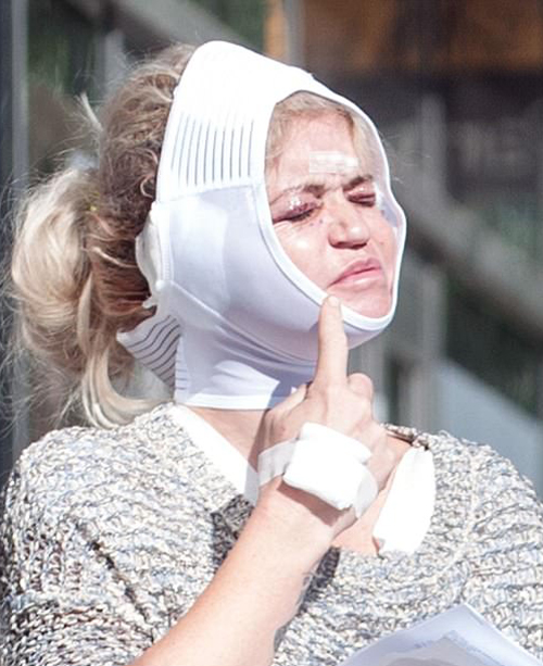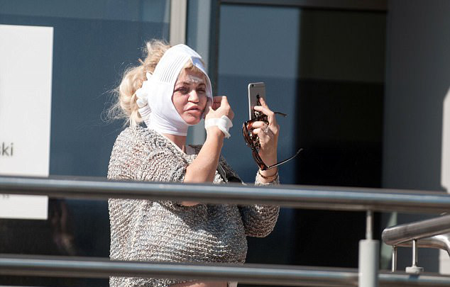 Danniella Westbrook rời khỏi phòng khám ở thành phố Wroclaw, Ba Lan với băng gạc quấn đầy mặt. Cô vừa trải qua cuộc phẫu thuật kéo dài 6 tiếng để cứu gương mặt không bị chảy xệ và biến dạng.