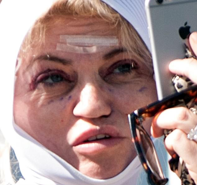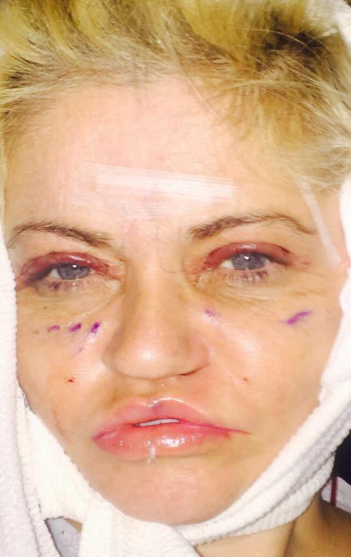 Cả gương mặt của cô sưng phồng, bầm tím và vẫn còn dấu mực từ ca phẫu thuật.