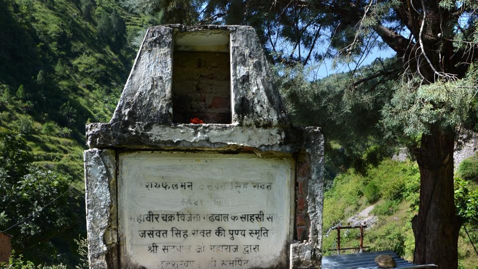 Tấm bia đá tưởng nhớ công lao của Jaswant Singh ở quê nhà Baryun, tỉnh Uttarakhand, Ấn Độ.