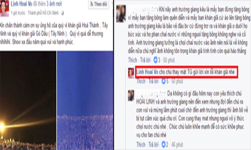 Khi khán giả phía dưới tiếp tục ồn ào, mất trật tự và khó có thể kiểm soát được, ban tổ chức chương trình đành lên tiếng "cầu cứu" nghệ sĩ Hoài Linh liền được anh đưa ra lời khuyên với người hâm mộ: "Xin cảm ơn bà con rất nhiều. Không có bữa nào vui như bữa nay, vui y như Tết. Trong không khí như thế này mong mấy anh chị phía trước ngồi xuống để mọi người phía sau được thấy. Linh mong các anh em phía bên ngoài chúng ta đừng có chọi đá vào trong này vì có người lớn, có trẻ em rất là nguy hiểm. Mong quý anh em thông cảm nha".