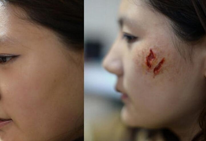 Đối với những vết sẹo trên mặt, yêu cầu của nhà sản xuất với nhân viên hóa trang rất cao. Từ trán, má, cằm, mũi, mắt... lại có những tiêu chí và yêu cầu khác biệt. Những miếng silicon giả tạo vết sẹo trên mặt càng mỏng càng tốt. Nhân viên hóa trang sẽ phải thể hiện kỹ năng tay nghề của mình trên lớp silicon này.