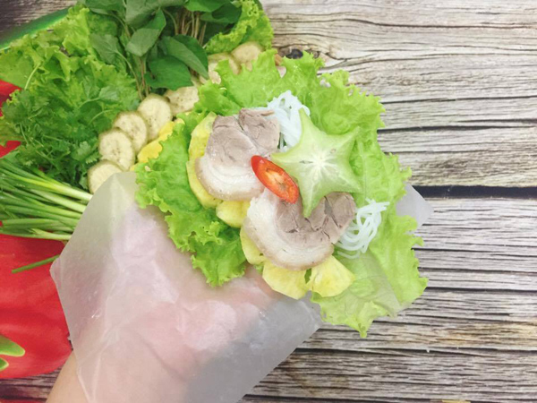 - Trải chiếc bánh tráng ra, xếp vào đó một ít bún tươi, một miếng thịt heo, lát dưa chuột, chuối xanh, khế, dứa và các loại rau tươi: xà lách, tía tô, húng, diếp cá… cuốn lại và chấm vào bát mắm tép.