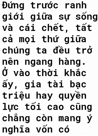 Đứng trước ranh giới giữa sự sống và cái chết, tất cả mọi thứ giữa chúng ta đều trở nên ngang hàng. Ở vào thời khắc ấy, gia tài bạc triệu hay quyền lực tối cao cũng chẳng còn mang ý nghĩa vốn có.